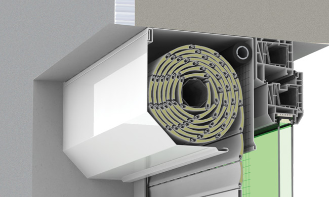 OUTBOX - MCA front mounted roller shutter with integrated insect net, round shaped box, ribbon driven